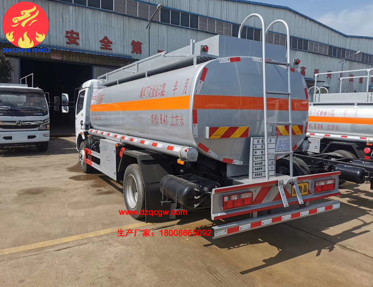 罐體容積10.3m3,罐體采用4.2mmQ235B鋼板制作,壹個鋁合金歐式罐口,專用油泵,可自吸自排,泵的出口在右邊,一個鋁合金海底閥(加裝聲光報警),正星大流量加油機及15米卷盤,加油機下掛至正駕一側(cè)。一套油氣回收裝置,一套防溢漏報警裝置,一個下裝口,一個靜電線盤,罐頂升降護欄。一個工具箱,一個防火帽,帶堵蓋,炮筒,配4KG滅火器。罐體先噴底漆再裝車,所有管道裝車時刷防銹漆,罐體金屬銀灰漆,貼反光線條及3號危險品標(biāo)。